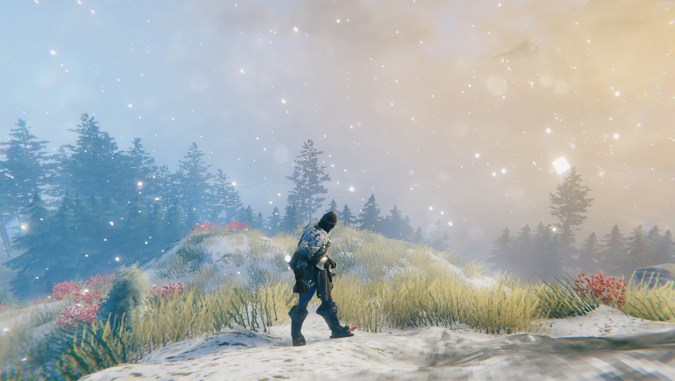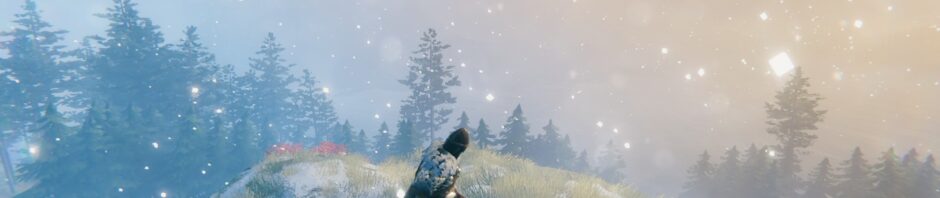 Screenshot from the game Valheim, Char looking into a landscape, standing in light snowfall.